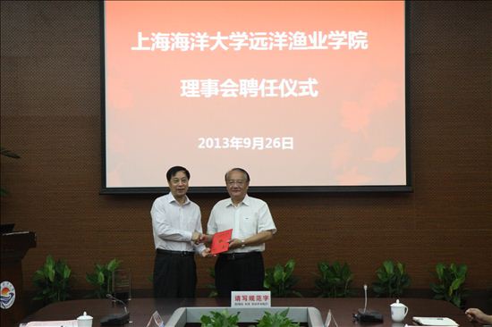潘迎捷校长给远洋渔业学院理事会理事长赵兴武颁发聘书。随后,赵理事长为远洋渔业学院理事会副理事长和理事颁发了聘书。