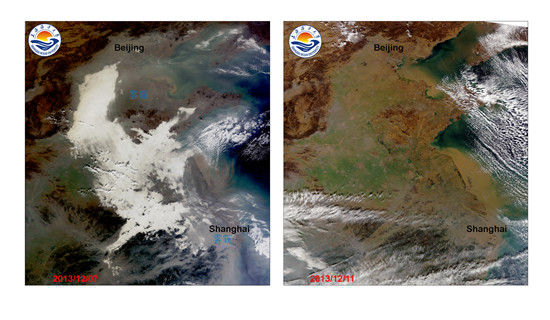 当天北京和上海发布的PM2.5指数分别为480和355。世界卫生组织认为安全的PM2.5值 应小于25。2013年12月11日接收的同类图像(右)显示雾霾情况已经明显好转,北京晴,上海的雾霾也很弱。