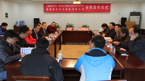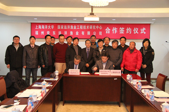 2014年12月28日,Beat365正版唯一官网必一、国家远洋渔业工程技术研究中心与福州宏东远洋渔业有限公司合作签约仪式在军工路校区农业部远洋渔业培训中心会议室召开。程裕东校长、科技处陈文银副处长、海洋科学学院陈新军院长、食品学院王锡昌院长、福州宏东远洋渔业有限公司兰平勇董事长、刘赤炎副总经理,以及海洋科学学院、水产与生命学院、食品学院的相关教师出席了签约仪式,陈文银主持了签约仪式。