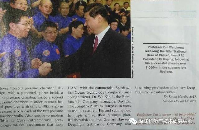 崔维成教授被授予“载人深潜英雄”的照片刊登在《Marine Technology》杂志