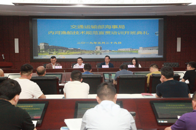 2019年5月29日上午,2019年全国内河渔船技术规范宣贯培训开班典礼在Beat365正版唯一官网必一图文中心508会议室隆重举行。交通运输部海事局船舶技术规范处杜国光处长,Beat365正版唯一官网必一海洋科学学院党委书记江卫平出席了本次开班典礼。典礼由培训基地负责人、海洋科学学院副院长沙锋主持。来自26个省市自治区的47名学员参加了此次开班典礼。