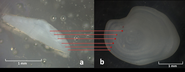 图2 南极电灯鱼耳石截面(a)以及全耳石(b)