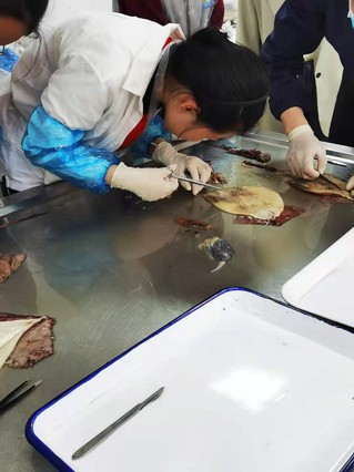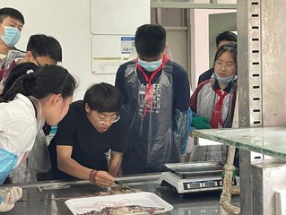听完了讲座,大家来到一楼的实验室,亲自尝试解剖实验,学院为他们提供了相关的实验样品。通过前期陈子越博士细心耐心的讲解,临港一中同学们都对头足类动物产生了浓厚的兴趣,能够亲手解剖鱿鱼更是让他们兴奋不已。