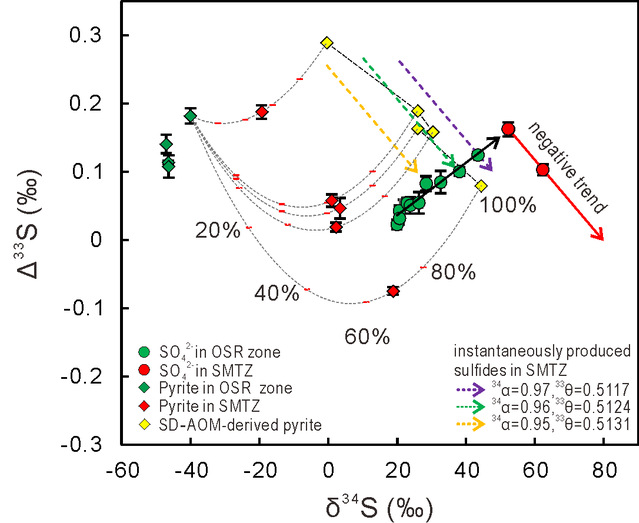 2018年,Gong等发现甲烷“冒泡区”重晶石多硫同位素组成Δ33S vs. δ34S具有负相关关系,与前人报道的OSR主导环境中孔隙水硫酸根Δ33S vs. δ34S正相关关系截然不同,由此创建了多硫同位素识别高甲烷通量环境的新方法,该方法已用于解决重大科学问题,如地球上最古老的冷泉碳酸盐岩成因之谜(Peng et al., 2022)。相比甲烷“冒泡区”,海底低甲烷扩散型渗漏环境分布更加广泛,那么在扩散型甲烷渗漏环境中孔隙水硫酸根Δ33S vs. δ34S的关系又是如何呢,即多硫同位素是否可以示踪扩散性甲烷渗漏环境SD-AOM作用?根据甲烷渗漏环境孔隙水氧硫同位素组成特征(Gong et al, 2021),研究团队提出科学假说:MSR过程中多硫同位素分馏主要受电子类型的控制,在低甲烷通量环境中孔隙水硫酸根Δ33S和δ34S之间仍然为负相关关系。
