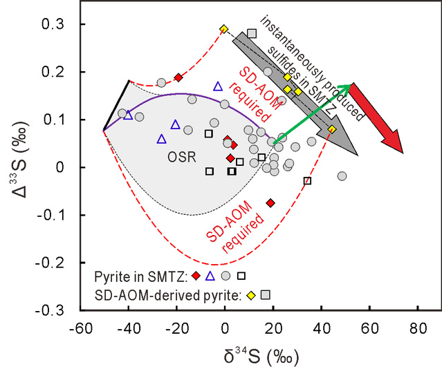图2. 海底扩散型甲烷渗漏环境黄铁矿多硫同位素组成特征。其中,灰色 区域为甲烷“冒泡区”和正常OSR主导的沉积环境黄铁矿多硫同位素组成。
