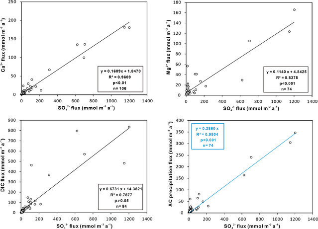 图2. 相关扩散通量和硫酸盐(SO42-)扩散通量的关系图。AC代表形成的自生碳酸盐,其形成速率为钙(Ca2+)和镁离子(Mg2+)通量之和。DIC为溶解无机碳
