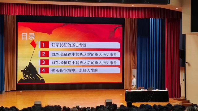 红军不怕远征难,万水千山只等闲。红军长征跨越15个省,越过了20多座大山,渡过30多条河流,经历600余次战斗,击溃数百个团,急行军每天30公里,总里程65000余里……除了这些令人惊叹的数据,还有鲜活动人的故事。通过“血战湘江”、“四渡赤水”、“强渡大渡河”、“飞夺泸定桥”、“翻越大雪山”、“穿过大草地”……陈泽銮饱含深情,为大家讲述着革命年代共产党人不怕牺牲、不畏艰险,为了人民幸福、民族独立而拼搏奋斗的感人故事。报告期间还穿插播放了爬雪山、过草地、激战腊子口等长征相关的影视片段,震撼人心,表现出红军大无畏的革命精神。