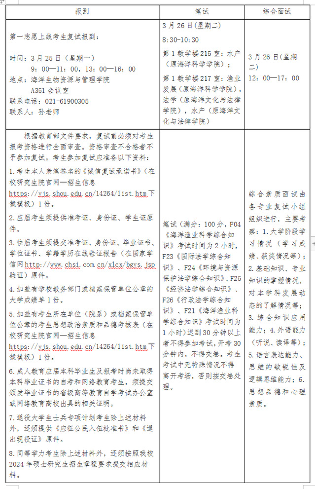 笔试主要为专业知识测试,水产(原海洋科学学院)和渔业发展(原海洋科学学院)笔试科目为F04《海洋渔业科学综合知识》;法学(原海洋文化与法律学院)笔试科目为F23《国际法学综合知识》、F24《环境与资源保护法学综合知识》、F25《经济法学综合知识》、F26《行政法学综合知识》;水产(原海洋文化与法律学院)笔试科目为F21《海洋渔业科学综合知识》。考试范围参见:https://yjs.shou.edu.cn/2023/0925/c14263a322262/page.htm