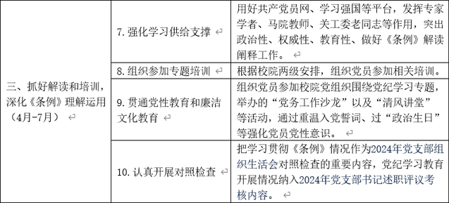 8.开展干部专题培训。学院分党校要精心设计课程、组织优质师资,在主体班次中安排《条例》教学辅导。 校级层面举办“学习贯彻新修订的《中国共产党纪律处分条例》”专题研讨班。坚持因材施教、分层分类,针对不同层级、不同领域的干部、关键岗位干部等重点对象做好培训的组织实施。