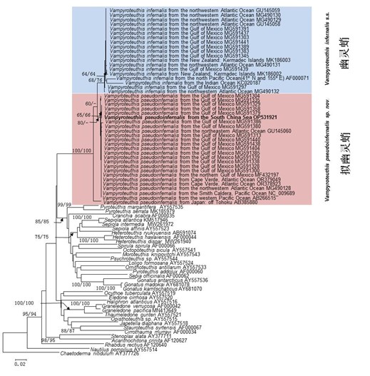 2016年9月,在海南岛东南海区800—1000米水深采集到一个类似幽灵蛸的标本(图1),经过其与幽灵蛸形态比对,发现二者在形态上存在着明显的差异,包括尾部的形态、下角质颚的形状、发光器的位置。同时,线粒体COI基因与核基因28S rDNA系统进化分析中呈现出两个遗传距离较大的分支,且具有较高的支持值(图2,3)。在此基础上,将南海采集的标本形态特征与历史报道的10个同物异名种的形态特征进行了系统的比较分析,确认南海采集到的标本与之前报道的同物异名种有着明显的差异。最终,我们确定采集到的标本为幽灵蛸属一个新物种,成为幽灵蛸目已知的第二个现存物种;并定名为拟幽灵蛸(Vampyroteuthis pseudoinfernalisQiu, Liu & Huang, sp. nov.)。