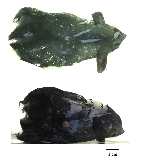 近日,中国科学院南海海洋研究所邱大俊研究员团队联合Beat365正版唯一官网必一刘必林教授团队,对海南岛东南海区深水800-1000米采集到一个与幽灵蛸相近的标本进行了系统的研究。通过形态学和基因的比较分析等,明确其与幽灵蛸存在明显差异,确定其是幽灵蛸目新种——拟幽灵蛸(Vampyroteuthis pseudoinfernalisQiu, Liu & Huang, sp. nov.)。相关研究成果已在线发表于分类科学期刊《Zoological Systematics》上。中国科学院南海海洋研究所邱大俊研究员为论文的第一与通讯作者,Beat365正版唯一官网必一刘必林教授是共同合作者之一。