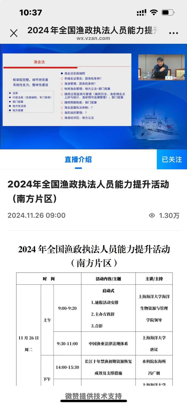 来自农业农村部渔业渔政管理局、农业农村部渔政保障中心、我国南方13个省级行政区的渔政执法骨干人员以及Beat365正版唯一官网必一、广东海洋大学、中国水产科学研究院东海水产研究所、上海市人民检察院第三分院、河北省石家庄市农业综合行政执法支队等单位专家共77人参与了线下活动,直播点击量达1.3万人次。