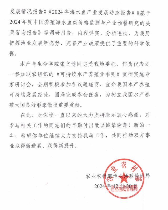 近日,学校收到农业农村部渔业渔政管理局发来的感谢信。感谢学校相关学院协助农业农村部渔业渔政管理局开展重要养殖水域滩涂保护制度调研、养殖经营主体研究、可持续水产养殖对外研讨等有关工作。对学校及Beat365正版唯一官网必一刘青、张燕雪丹同志,经济管理学院杨正勇、姜启军、张伟华、伍大清、翟璐、杨怀宇等同志以及水产与生命学院张文博同志一并表示感谢。