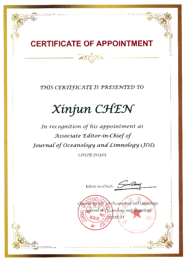 近日,陈新军教授被《Journal of Oceanology and Limnology》(JOL)聘为副主编(2024-2030)。《Journal of Oceanology and Limnology》1982年创刊,是由中国海洋湖沼学会主办、中国科学院海洋研究所承办的学报类学术期刊,以双月刊的形式出版。内容涵盖生物学(生物信息学、生物工程)、物理学(数学和计算物理学)、地质学(沉积学、地球物理学、古生物学、地球化学)、化学(地球化学、生物化学)、水文学、气象学和地理学等。它是中国海洋湖沼学会唯一的官方学术期刊,是国际同行评审期刊,由中国科学出版社和施普林格出版社合作出版。该期刊被Science Citation Index Expanded (SCIE)、Scopus等多种数据库收录。