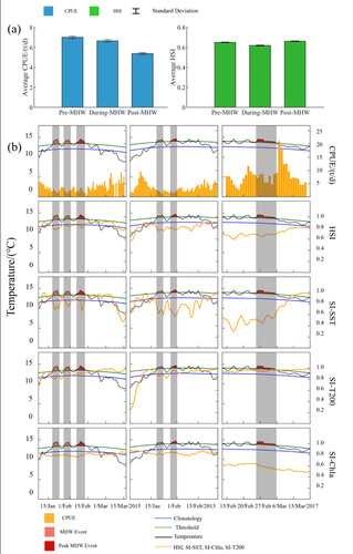 3 MHW事件前后CPUEHSISI的变化。(a)所有MHW事件前后CPUEHSI的平均值;(b20131-2月和20172-3MHW事件期间, CPUE、温度、HSISI的时间序列。阴影区域表示MHW持续时间,深红色表示MHW峰值日。所有MHW事件均发生在59°-60°W44°-46°S之间。