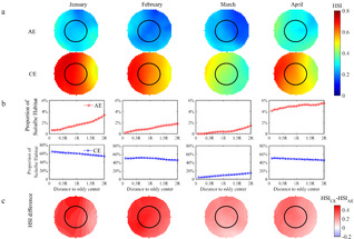 2 1-4月涡旋中的HSI分布模态、涡旋内适宜HSI与距涡心距离的关系以及各月气旋涡与反气旋中的HSI差异比较