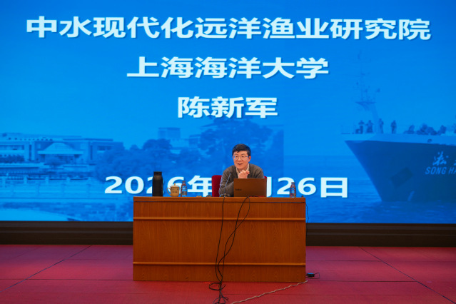 2月26日,国家远洋渔业工程技术研究中心主任、教育部重点实验室主任、中水现代化远洋渔业研究院院长陈新军教授,应邀在中水集团远洋渔业股份有限公司2026年年度工作会上做《现代化远洋捕捞发展对策与建议》专题讲座,讲座从远洋渔业产业背景与现状、面临的挑战与机遇、现代化远洋捕捞业内涵与对策等三个方面,结合远洋渔业4.0的理念,提出了中水集团全产业链发展(捕捞生产,监管,加工与销售,后勤保障与服务)的技术创新体系,讲座报告取得预期的效果,进一步加强了学校与中水集团开展产教融合的深度、广度和高度。